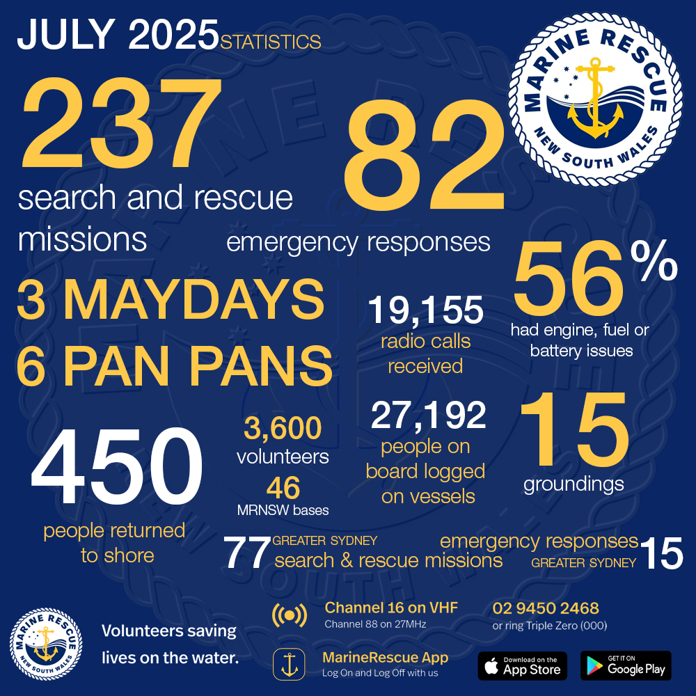 Members of the boating community who find themselves in need of assistance can contact Marine Rescue NSW using VHF Channel 16, the MarineRescue App or by calling (02) 9450 2468 or Triple Zero (000).